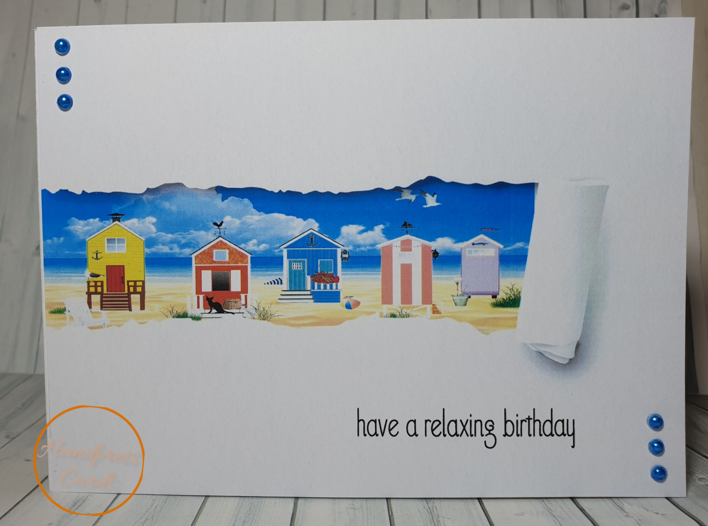A row of beach huts behind a ripped paper image are the features on this happy birthday greeting card. This is a print card. The inside of the card is blank, so you can add your own personalised message.