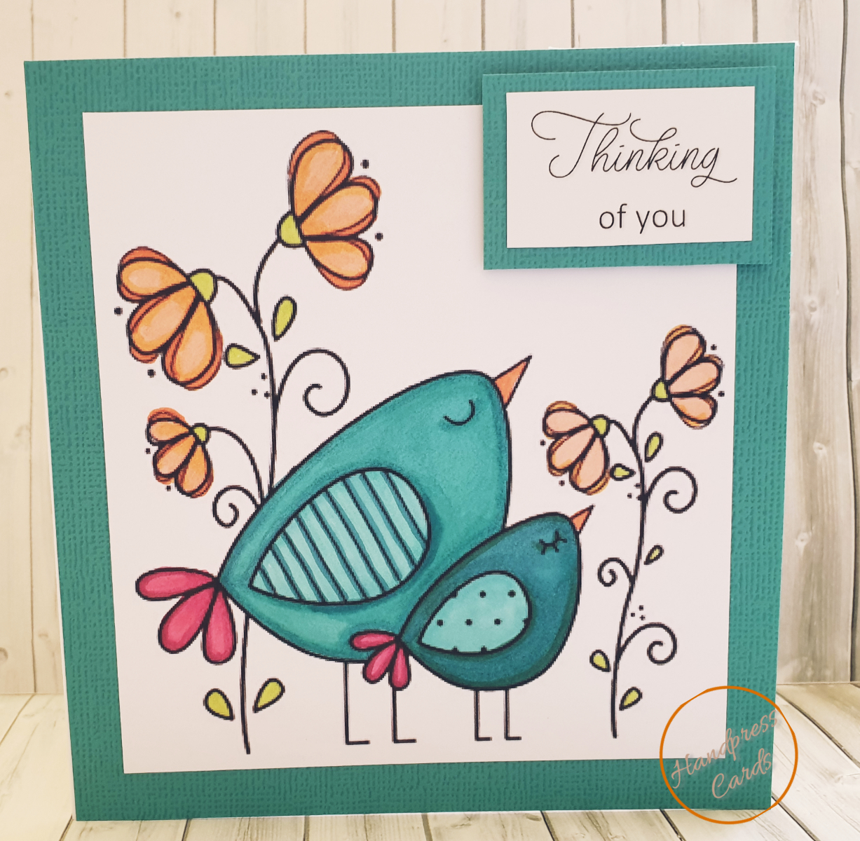 Two hand coloured birds with an abstract theme feature on this greeting card, set off against a coloured matched background. The inside of the card is blank, so you can add your own personalised message.
